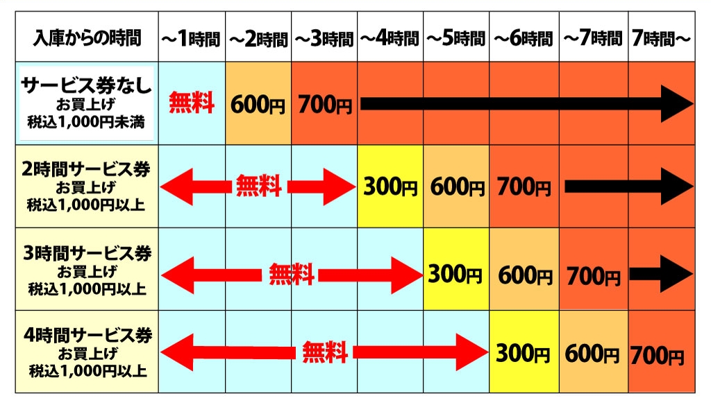※お買上げが税込1,000円未満の場合、最初の1時間無料超過後は、入庫時刻から課金開始となります。