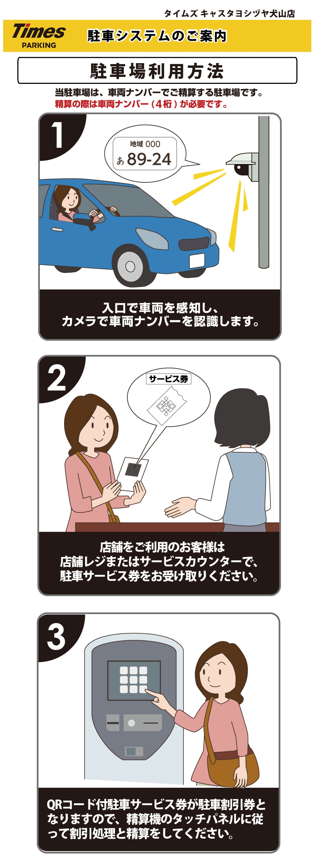 新しい駐車システムは、入口でカメラが車両ナンバーを認識し、車両ナンバーでのご精算となります。最初の1時間は無料となります。