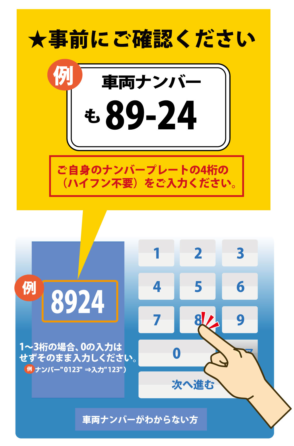お帰りの際は、ご乗車の前に、各駐車場フロアに設置した精算機のタッチパネルに従って、割引処理と精算を行ってください(駐車場出口に精算機はありません)。精算を行う場合は、ナンバープレートの4桁の数字が必要となりますので、事前にご確認ください。