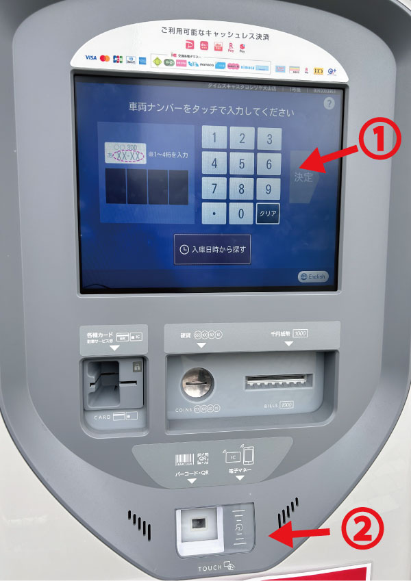 車両ナンバー(ナンバープレートの4桁の数字)をタッチパネル①で入力してください。決定ボタンを押すと、お客様の車両の画像とナンバーが表示されます。駐車サービス券があれば、ランプが点滅している②にサービス券のQRコードをかざしてください。