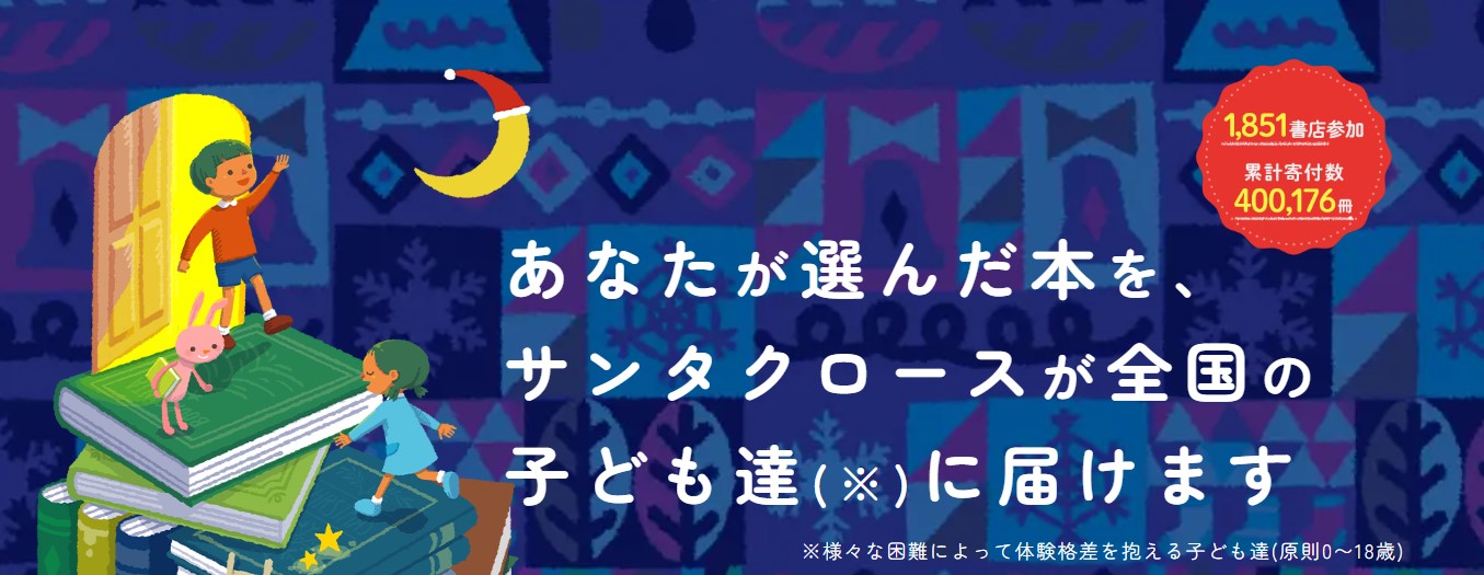 「ブックサンタ」は、認定NPO法人チャリティーサンタが全国の様々な困難によって体験格差を抱える子ども達に本を贈るため、2017年に書店と連携してスタート。現在では全国のNPOと1,851店舗の書店が連携し、過去7年間で累計40万176冊の本が寄付されています。