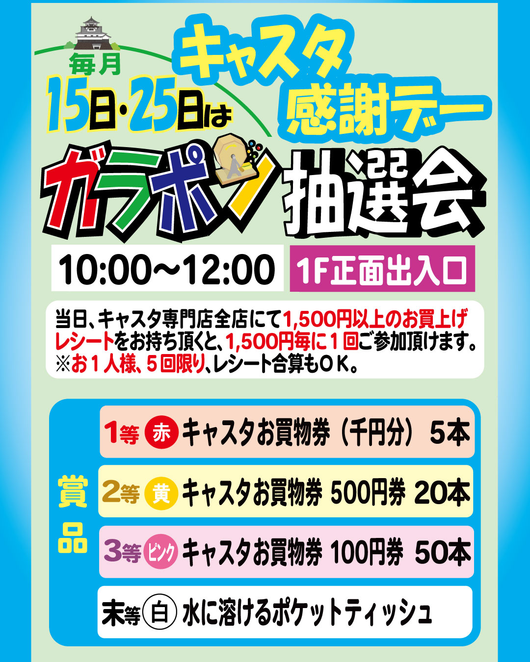 毎月15日・25日は「キャスタ感謝デー」です。キャスタカードのポスターが掲示されている専門店で当日お買い物していただくと、キャスタポイントが通常の2倍となります(一部店舗を除く)。