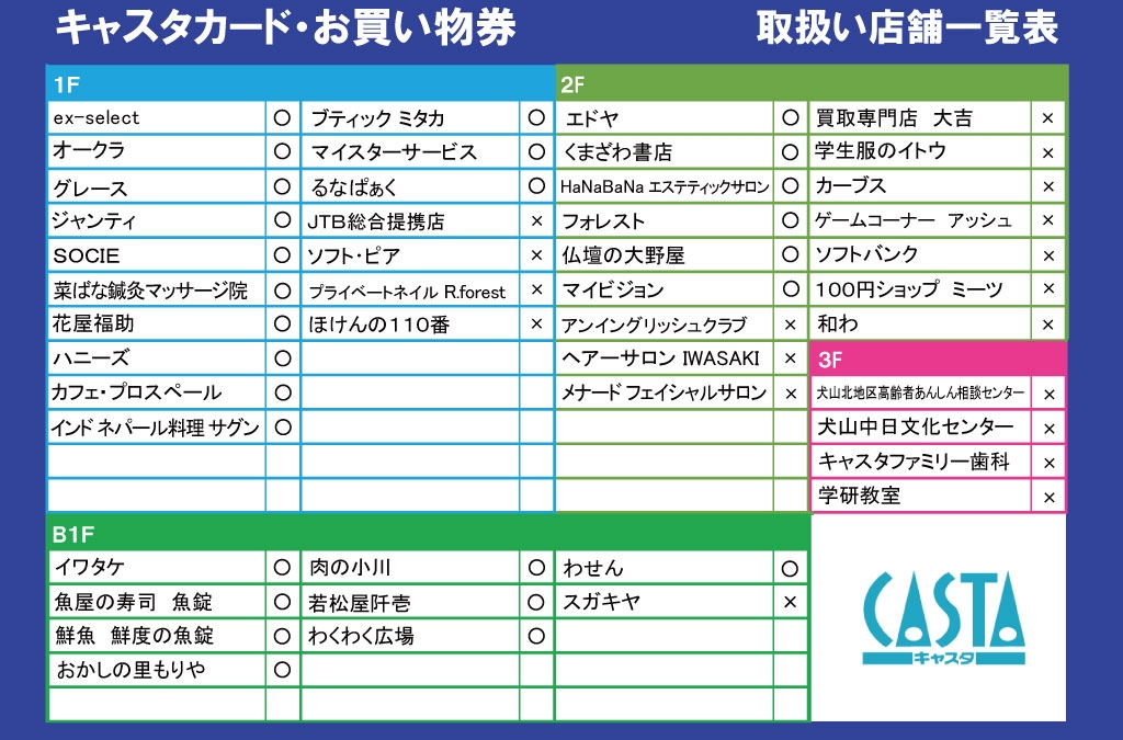 下記、〇の付いている店舗および施設にて、毎日のお買物の際に「キャスタポイントカード」をご提示下さい。お買上げ金額に応じて、ポイントをお付けいたします。