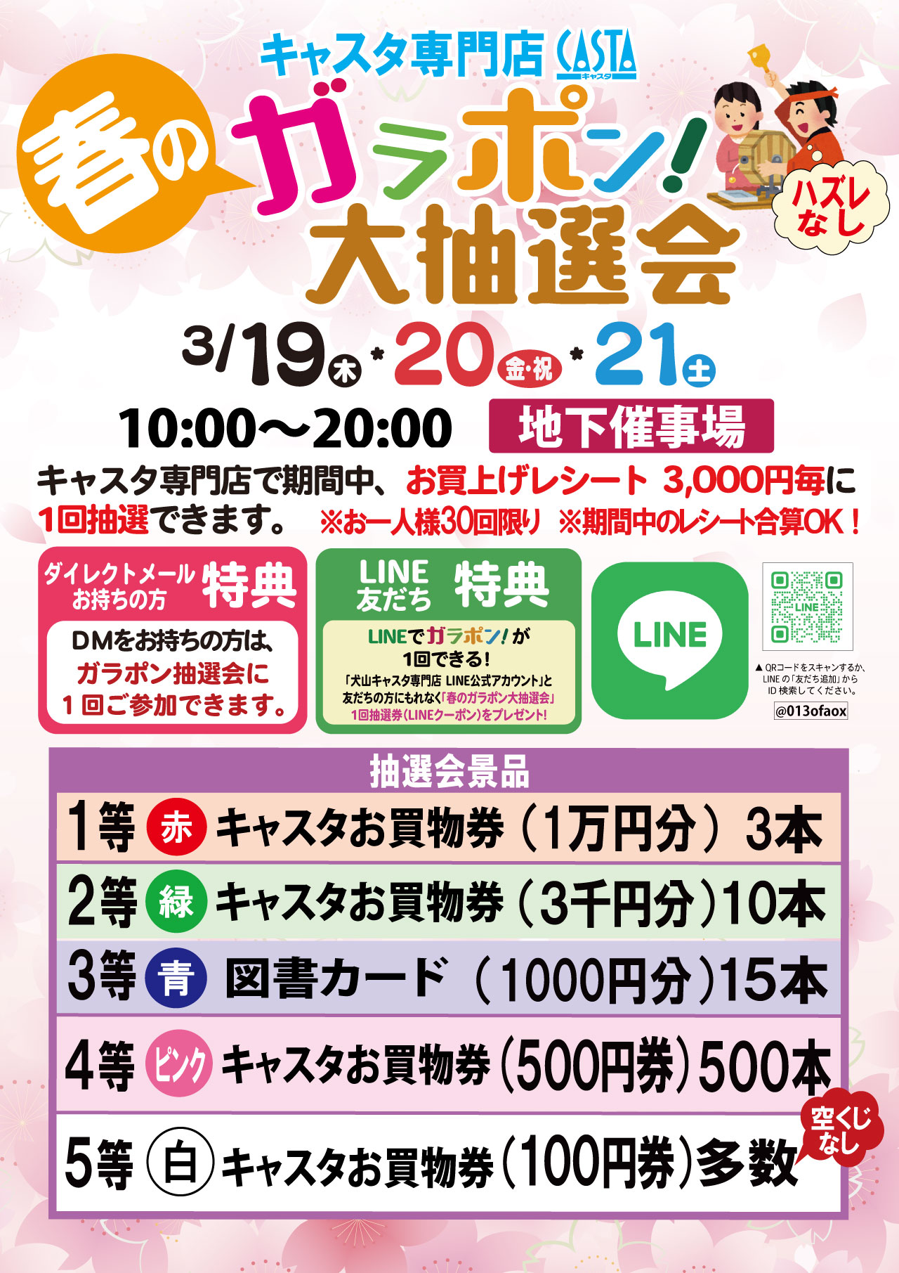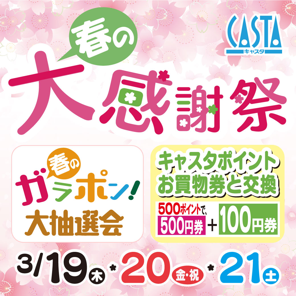 期間中の3日間は、キャスタ専門店でお買上げレシート3,000円毎に1回抽選できる「春のガラポン大抽選会」を地下催事場で開催 ♪ 1等にキャスタお買物券1万円分、2等に同お買物券3000円分、3等に図書カード1000円分など、豪華賞品をご用意!