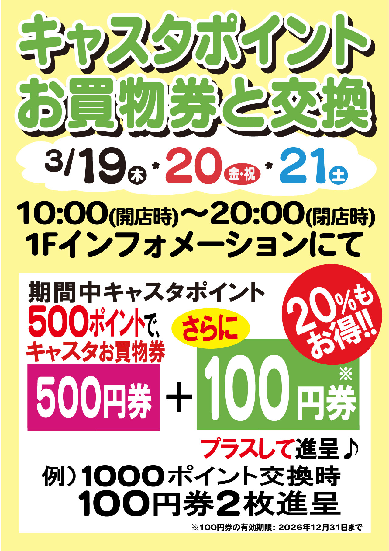 期間中はキャスタポイント500ポイントをお買物券500円券に交換する際、100円券をプラス!する超お得な特典も実施いたします!!