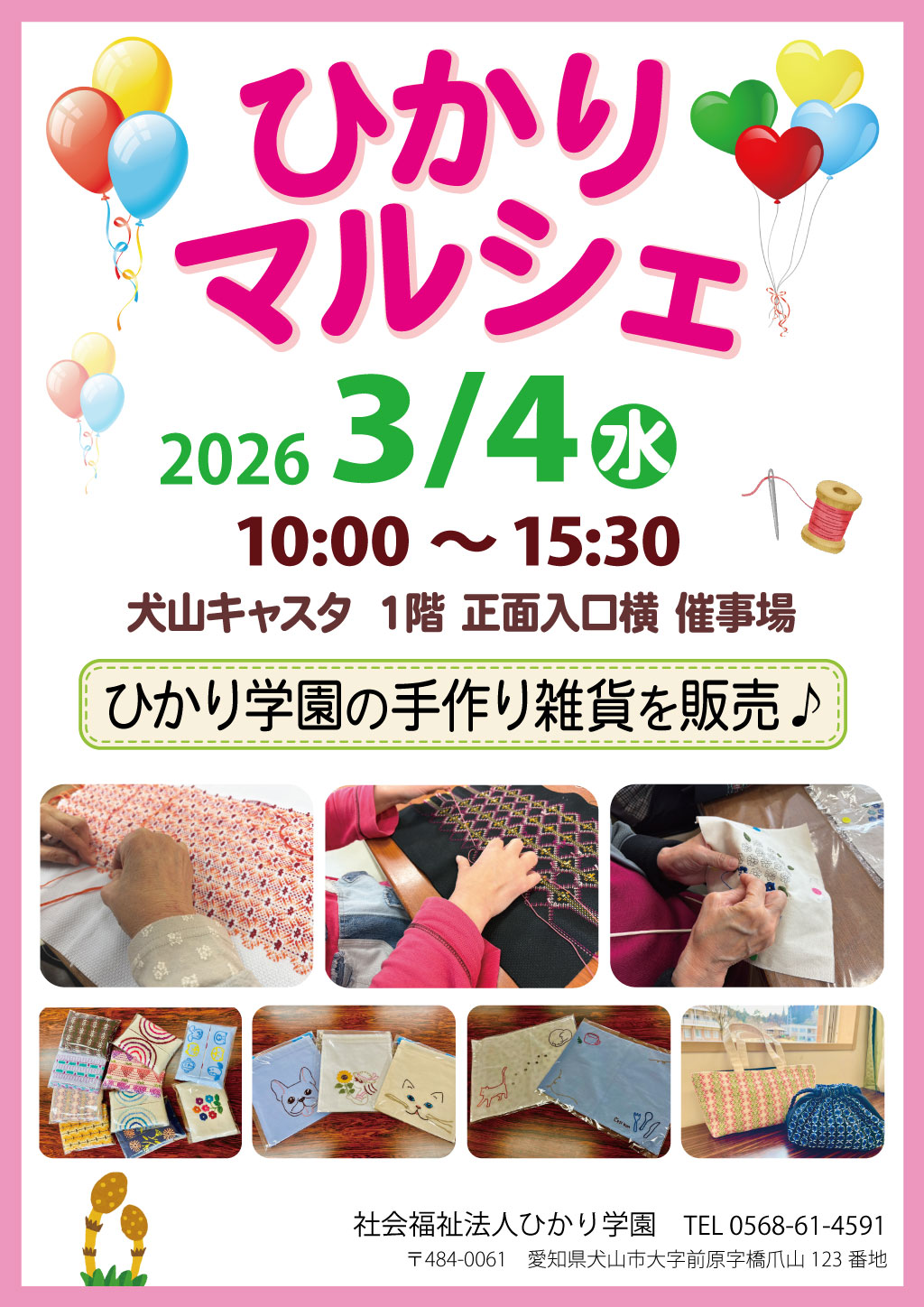 社会福祉法人ひかり学園(愛知県犬山市前原)は2026年3月4日(水)、犬山キャスタ 1F 正面入口横 催事場にて、手作り雑貨を販売する「ひかりマルシェ」を開催いたします。