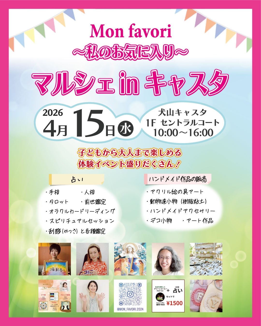 マルシェやイベントを各地で開催している「Mon favori」は、4月15日(水)、犬山キャスタ 1F セントラルコートで 「Mon favori ~私のお気に入り~ マルシェ in キャスタ」を開催いたします。