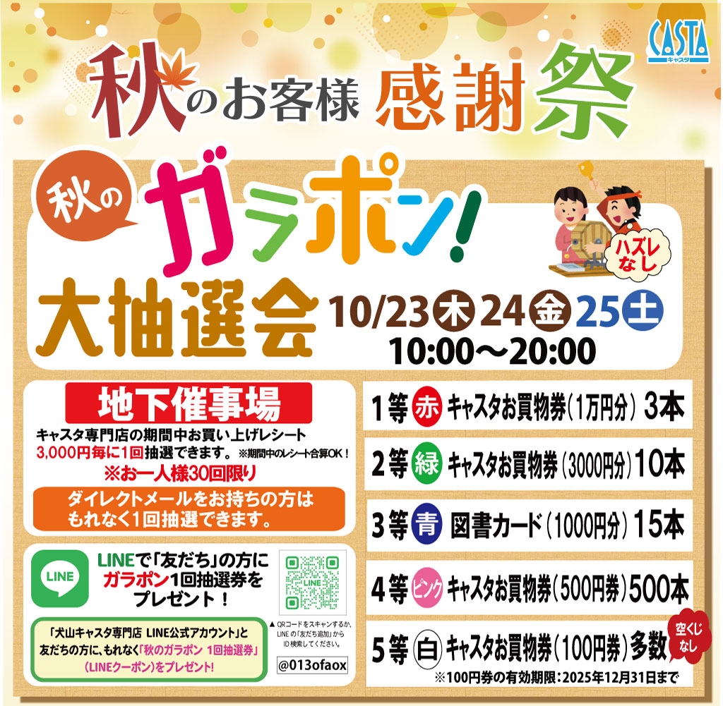 期間中は、キャスタ全館をあげて、お得なセールを実施! さらにキャスタ専門店でのお買上げレシート3000円毎に一回チャレンジできる「秋のガラポン大抽選会」を地下催事場にて開催いたします(お一人様 30回まで)。さらに犬山キャスタ公式LINEと友だちの方も、もれなく1回チャレンジできます!