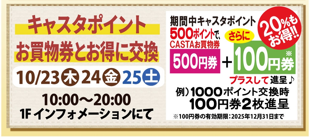 同じく10月23日(木)~25日(土)の3日間は、キャスタポイント500ポイントをお買物券に交換されるお客様に、通常の500円券に加えて、さらに100円券をプレゼント!(例えば1000ポイント交換時は、500円券2枚と100円券2枚となります)。この機会にぜひお得にポイント交換してください。