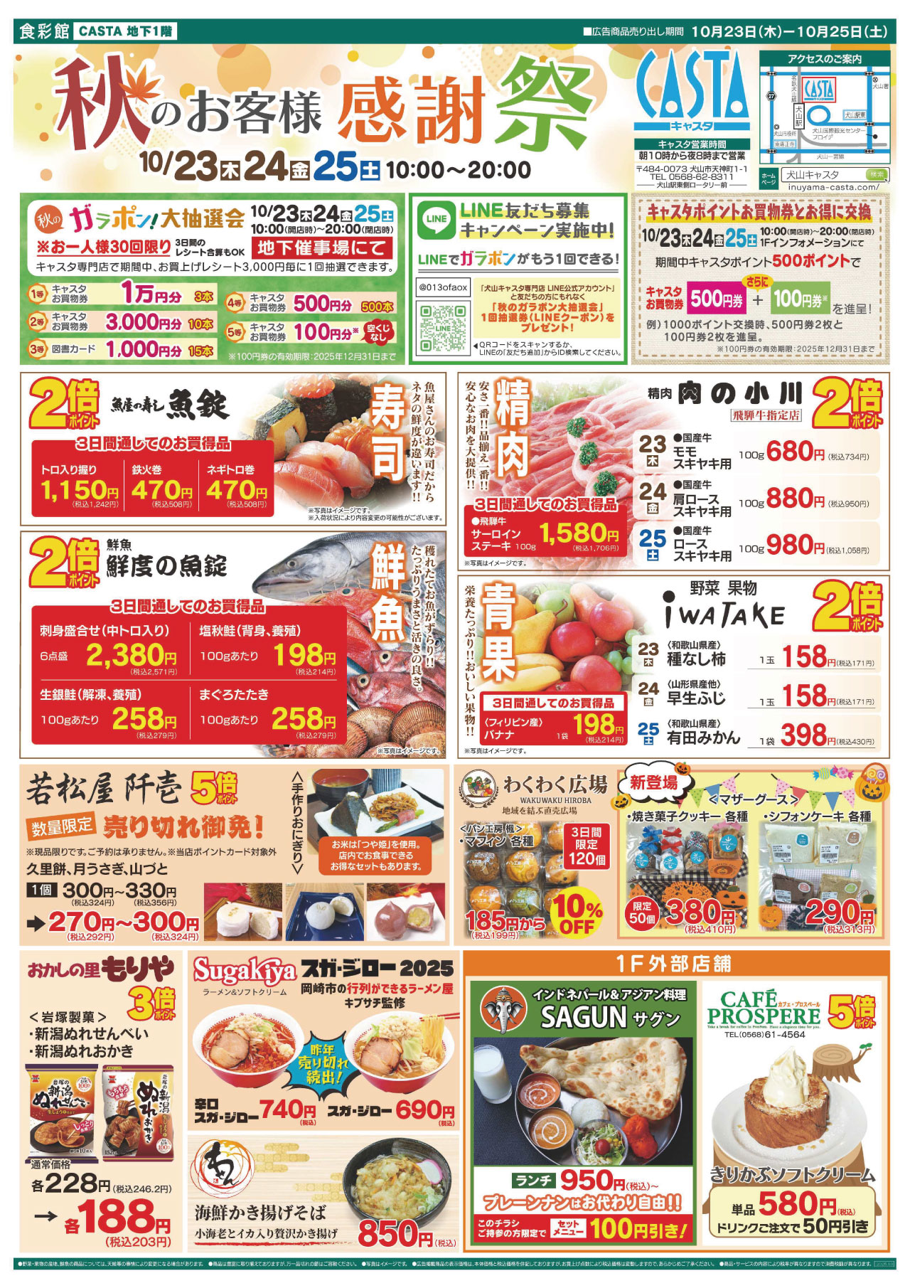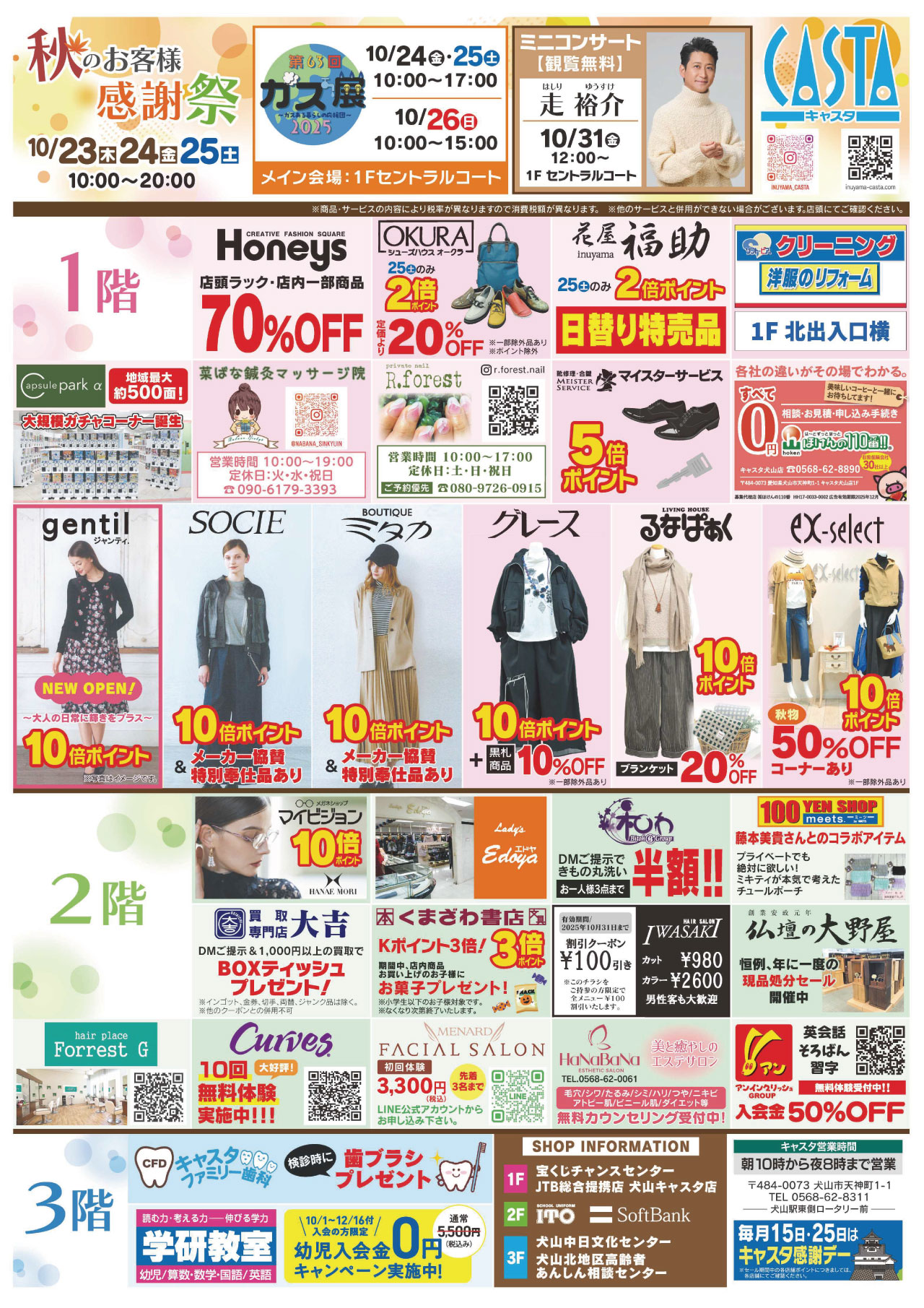 犬山キャスタでは、日頃のご愛顧に感謝の気持ちを込めて、10月23日(木)~25日(土)の3日間、「秋のお客様感謝祭」を開催いたします。
