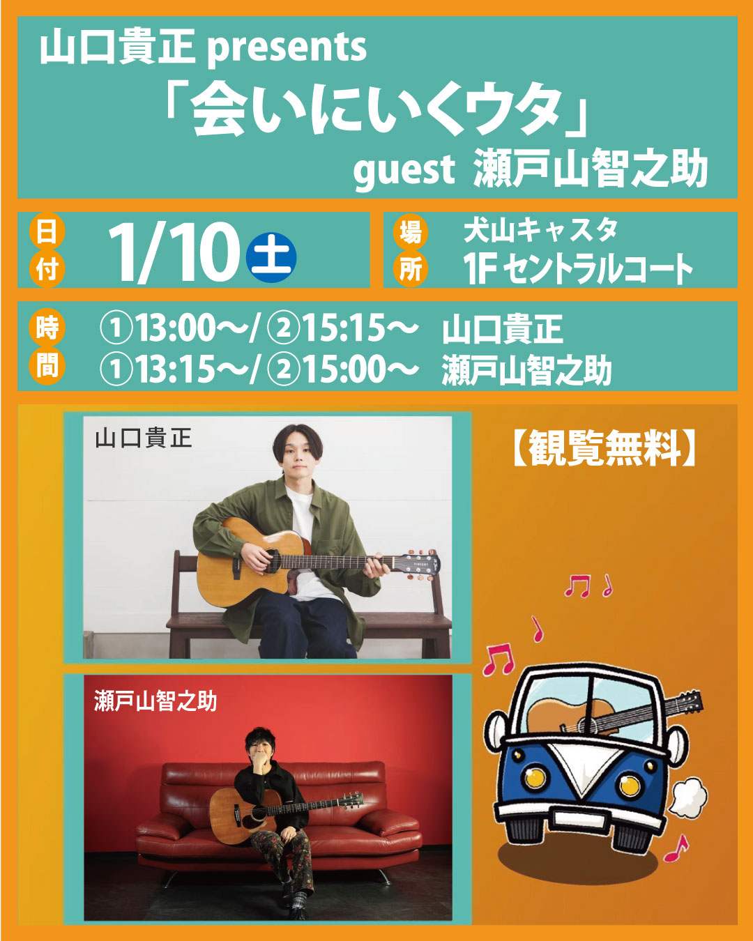 犬山キャスタでは2026年1月10日(土)、1Fセントラルコートにて、ミニコンサート “山口貴正presents「会いにいくウタ」 guest 瀬戸山智之助” を開催いたします♪ 【観覧無料】。