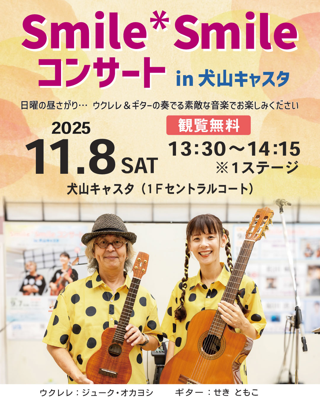 犬山キャスタでは2025年11月8日(土)、1Fセントラルコートにて、ウクレレとギターの生演奏、Smile*Smileコンサートを開催いたします♪ 【観覧無料】。