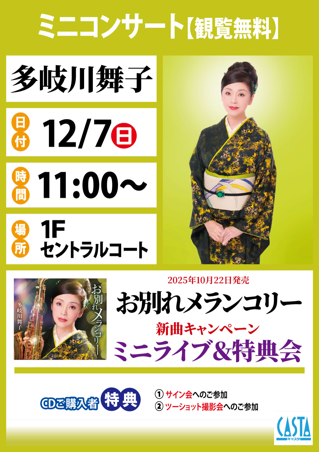 犬山キャスタでは12月7日(日)11時より、1Fセントラルコートにて、多岐川舞子さん(日本コロムビア)のミニコンサートを開催いたします ♪ 【観覧無料】。