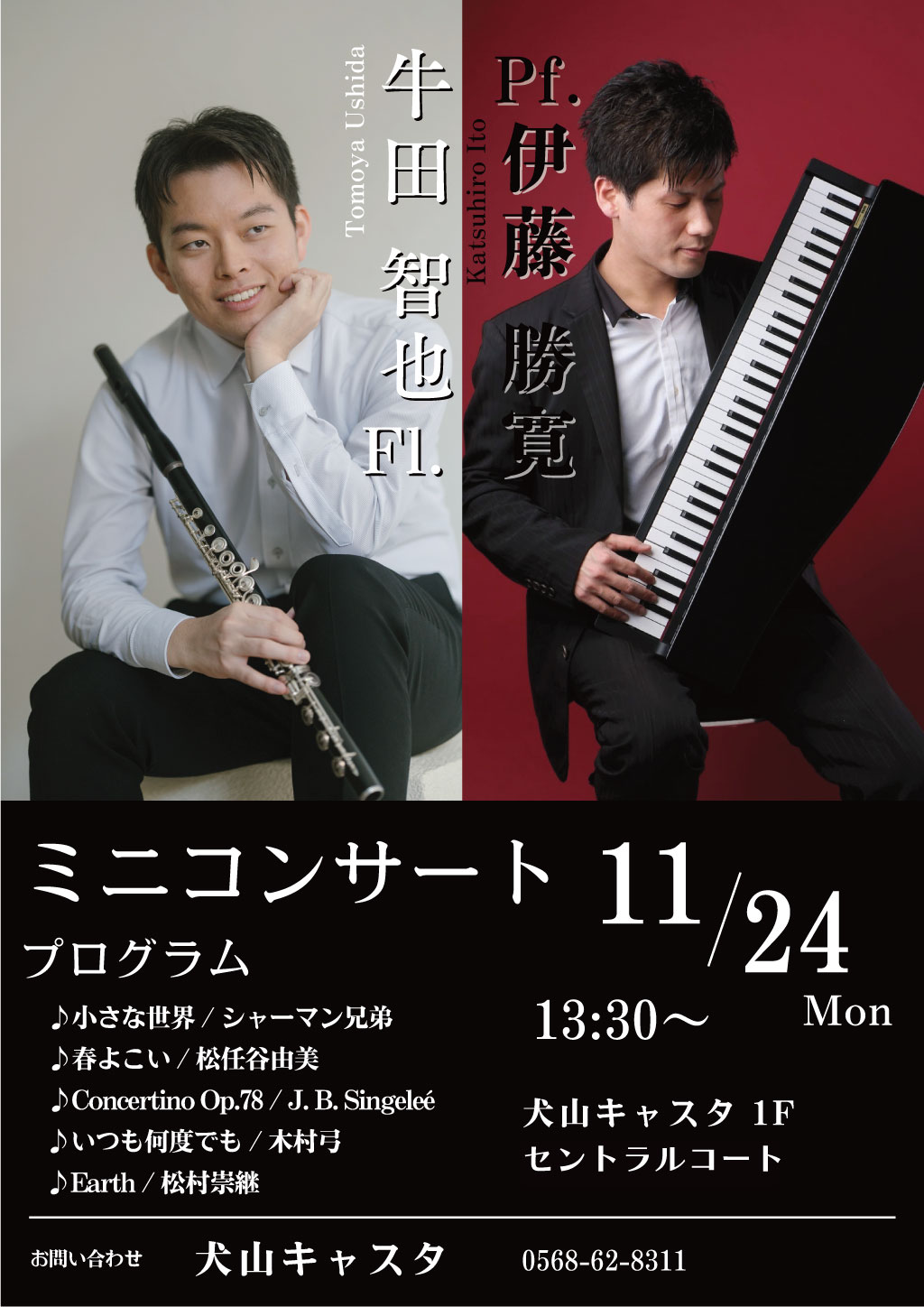 犬山キャスタでは11月24日(月・振休)13時半より、1Fセントラルコートで、牛田智也さん(フルート)と伊藤勝寛さん(ピアノ)の「木製フルートとピアノのミニコンサート」を開催いたします♪ 【観覧無料】。