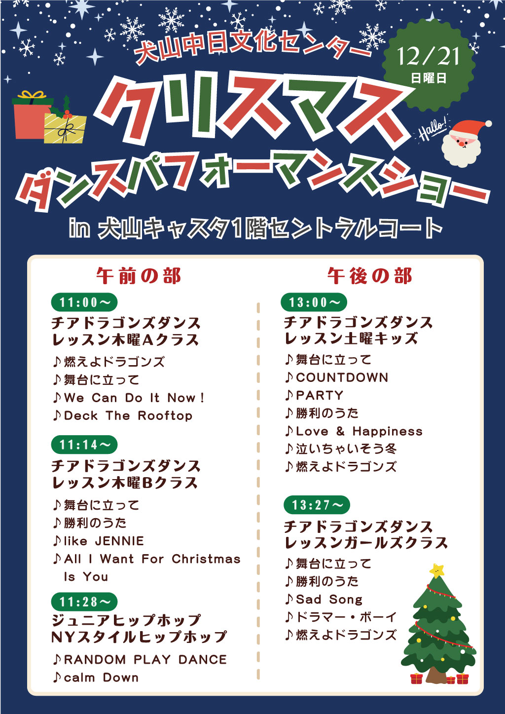 犬山キャスタ3F 「犬山中日文化センター」は12月21日(日)、1Fセントラルコートにて「クリスマスダンスパフォーマンスショー」を開催いたします。