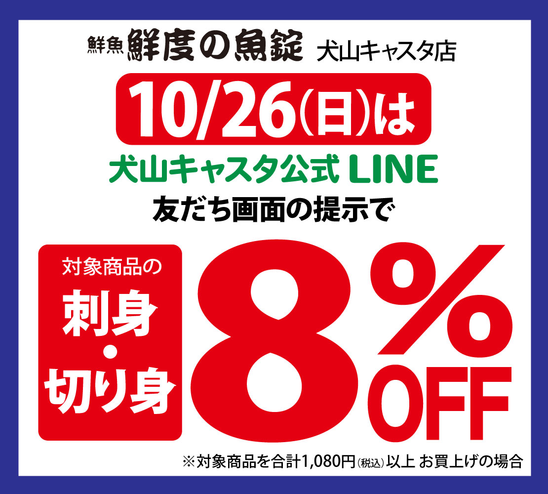 「鮮度の魚錠 犬山キャスタ店」では10月26日(日曜日)、対象商品の刺身・切り身を合計1,080円(税込)以上お買い上げの場合、ご精算前に犬山キャスタ LINE公式アカウントのお友だち画面をご提示いただくと表示価格より8%オフ!(※) この機会にぜひご来店ください。